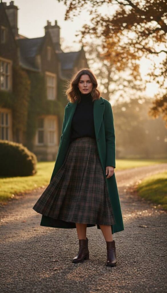 Embrace heritage with a contemporary twist. A midi length, pleated skirt in a rich brown and forest green plaid, reminiscent of classic British tailoring, forms the foundation. Pair this with a fitted black cashmere turtleneck for a sleek upper half, allowing the skirt to be the focal point. Layer a long line, single breasted wool coat in a solid forest green or deep burgundy over the ensemble, providing warmth and a cohesive color palette. For footwear, select a sturdy yet refined short boot in dark brown leather, perhaps a combat boot style with minimal detailing, adding an edge to the traditional print. A vintage inspired leather satchel completes the look.