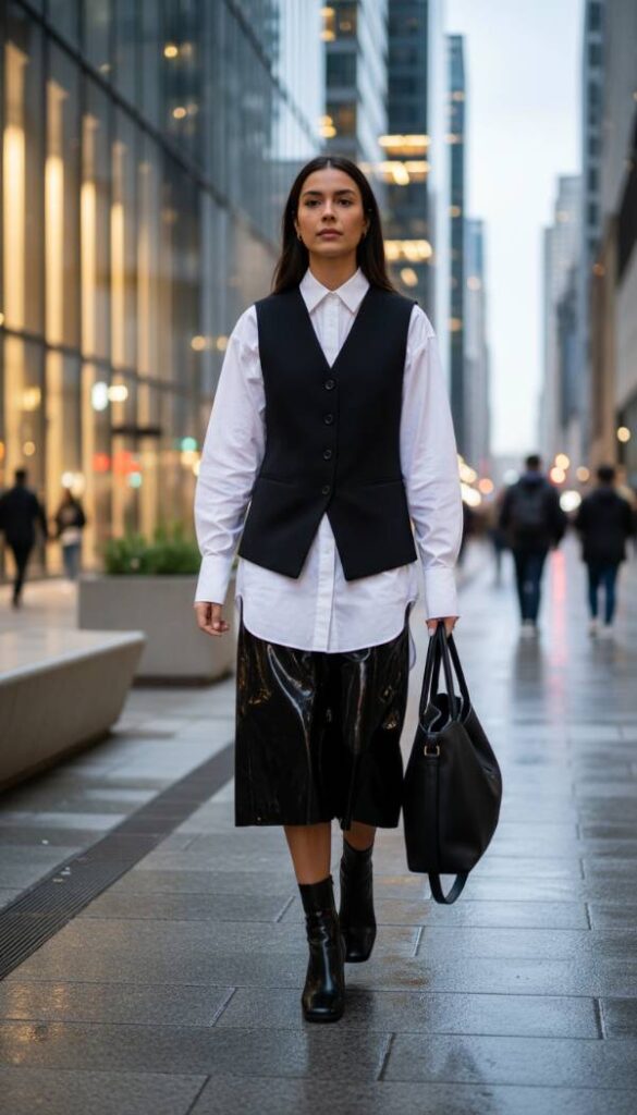 Command attention with the high shine allure of patent leather. A sleek, black patent leather midi skirt, featuring a sophisticated A line cut or a subtle flare, creates an instantly glamorous foundation. Pair it with a crisp white oversized shirt, left untucked, for an intriguing play on texture and formality. A tailored black wool vest worn over the shirt adds a refined, structured layer. The ultimate footwear choice is a matching black patent leather short boot, perhaps with a comfortable block heel and a modern square toe, tying the glossy elements together seamlessly. A sharp, minimalist clutch bag enhances the powerful aesthetic.