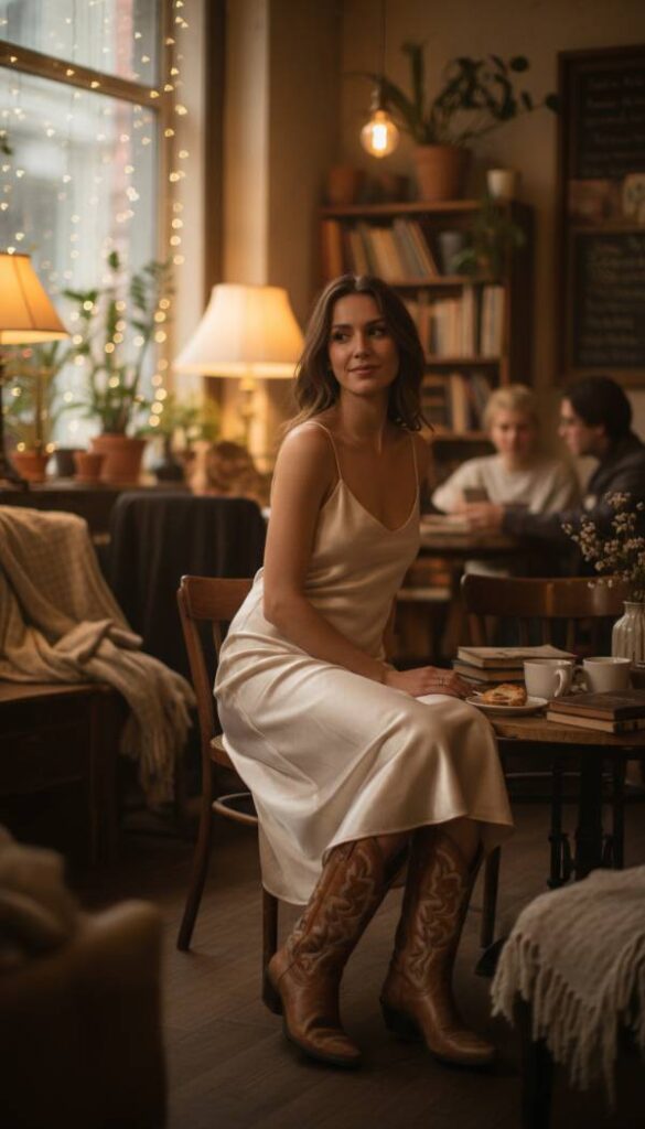 Imagine the exquisite interplay of textures: the supple, burnished leather of traditional western boots grounding the ethereal fluidity of a charmeuse slip dress. This juxtaposition creates a captivating silhouette, where the dress shimmers with every subtle movement, its delicate straps hinting at sophisticated allure. The boots, perhaps a rich chocolate brown or a deep, aged tan, offer a robust counterpoint, their intricate stitching a testament to artisanal craftsmanship. It is a look that whispers of effortless cool and understated sensuality, perfect for an evening of intimate conversation.