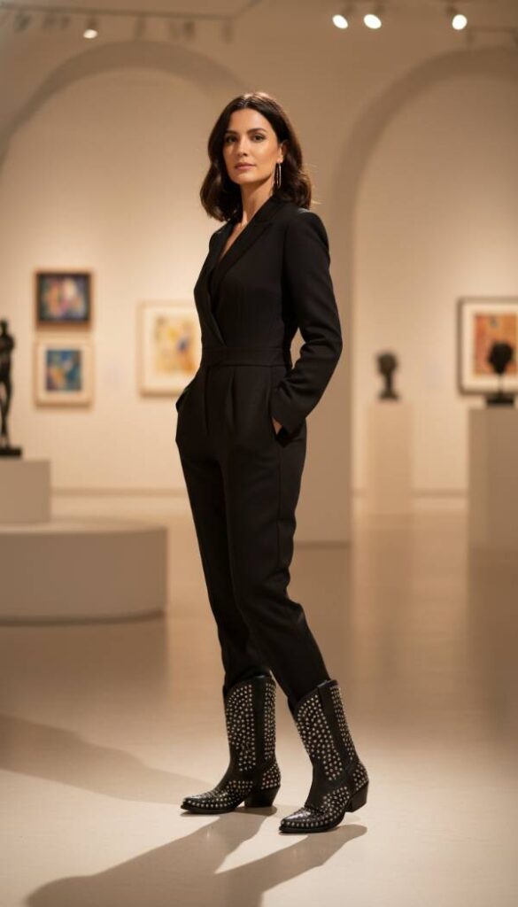 Imagine the striking contrast of studded cowboy boots, their metallic embellishments adding a rebellious sparkle, against the sophisticated simplicity of a sleek black jumpsuit. The jumpsuit, perhaps with a flattering wide leg or a tailored slim fit, serves as an elegant canvas, allowing the boots to become the undeniable focal point. The studs, whether subtle or boldly scattered, catch the light with every movement, injecting an edgy glamour. This ensemble is a masterclass in understated power, offering a chic, modern, and confidently alluring look for a captivating date night.