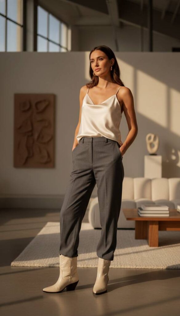 Imagine the exotic texture of croc embossed cowboy boots, their rich, simulated reptilian scales adding an element of luxurious intrigue. These are expertly paired with the fluid elegance of a silk camisole and impeccably tailored trousers. The camisole, with its delicate straps and subtle sheen, offers a touch of sensual sophistication, while the trousers, perhaps a wide leg or cigarette cut, provide a polished foundation. This ensemble is a masterclass in textural interplay, blending refined fabrics with bold footwear for a look that is both modern and timelessly chic, exuding quiet confidence.