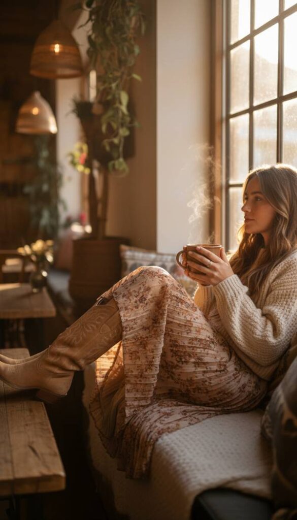 Picture the luxurious softness of suede cowboy boots, their velvety texture inviting to the touch, perfectly complementing a flowing midi skirt. This skirt, perhaps in a rich autumnal hue or a delicate floral print, moves with an elegant swish. Complete the look with a chunky knit or fine gauge cashmere sweater, tucked artfully or draped loosely for an air of relaxed sophistication. This ensemble masterfully blends comfort with chic, offering a warm and inviting yet undeniably stylish aesthetic perfect for a cozy evening out, exuding approachable elegance.