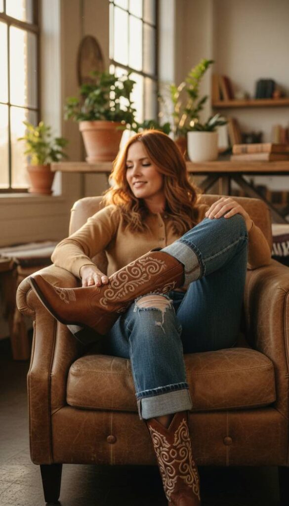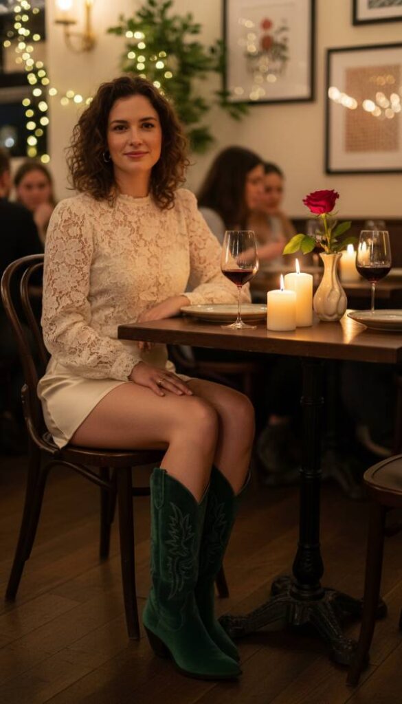 Imagine the contemporary cool of cowboy booties, their shorter shafts offering versatility, artfully styled with high waisted jeans and a chic crop top. The jeans, perhaps a perfectly faded straight leg or a flattering flare, cinch at the waist, elongating the legs. The crop top, revealing a hint of midriff, adds a playful, confident touch. This ensemble is the epitome of effortlessly cool, blending casual comfort with undeniable sex appeal, perfect for a relaxed yet stylish date. It’s an inviting look that whispers of natural charm and modern sensibility.