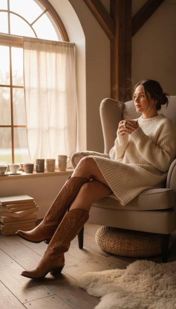 Tall Cowboy Boots With A Cozy Sweater Dress