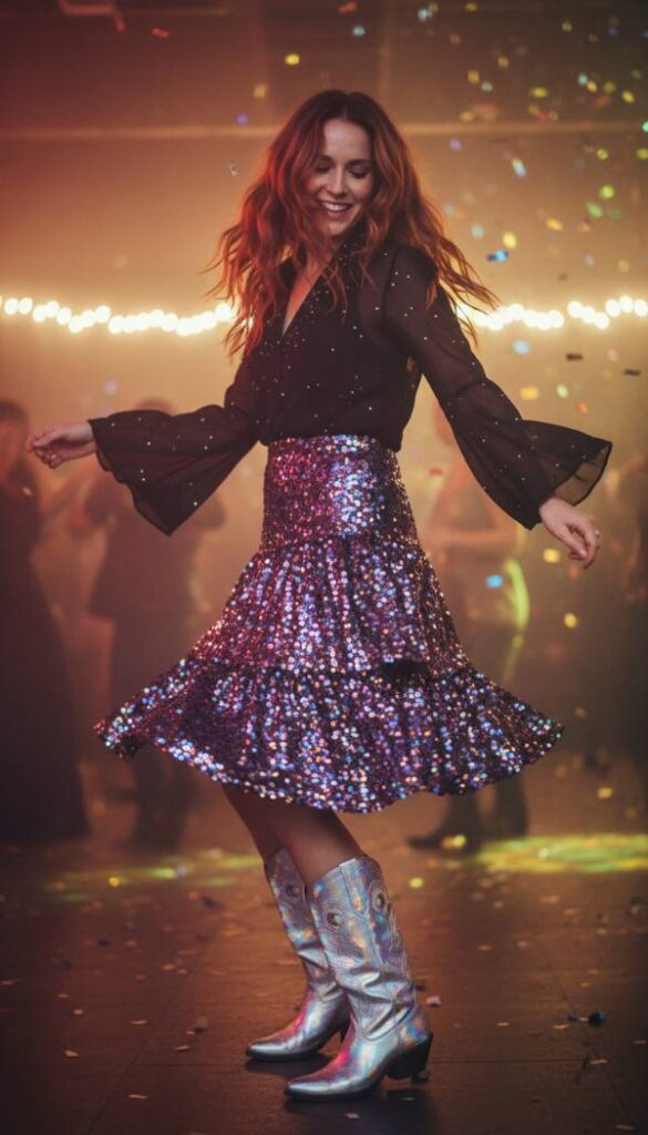Envision the dazzling spectacle of metallic cowboy boots, their reflective surfaces catching every light, paired with the brilliant shimmer of a sequin skirt. This is an ensemble designed for pure enchantment and undeniable glamour. The skirt, perhaps a mini or midi length, is a cascade of glittering sequins, while the boots, in silver, gold, or even rose gold, add an audacious, celebratory flair. This look is a bold declaration of confidence and joy, perfect for dancing the night away or making an unforgettable entrance, radiating playful sophistication.