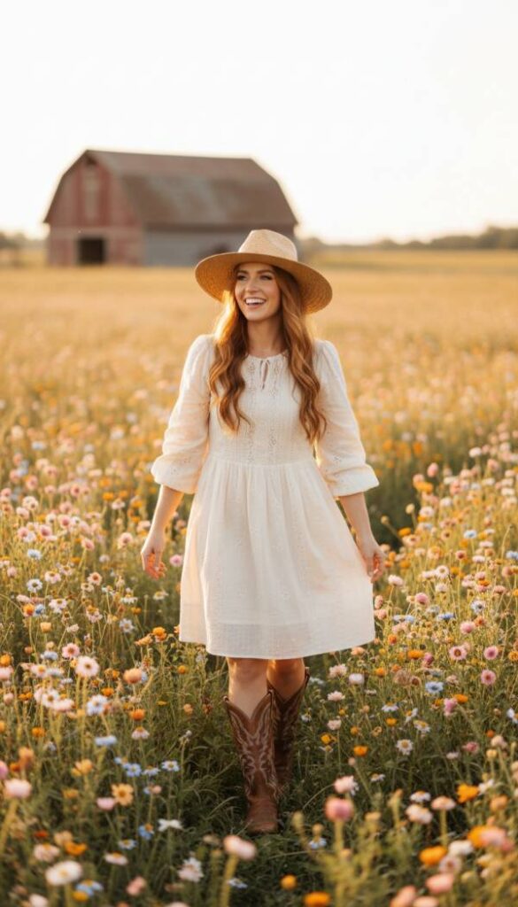 Envision the playful sway of fringe cowboy boots, their every step a dance, perfectly matched with the whimsical charm of a bohemian chic dress. The dress, perhaps crafted from a delicate lace, embroidered cotton, or a floral print, flows with an airy grace, evoking a free spirited elegance. The fringe on the boots adds a dynamic, textural element that beautifully complements the dress’s relaxed silhouette. This outfit creates a dreamy, romantic aesthetic, perfect for an outdoor evening or a relaxed yet stylish date, emanating an inviting and natural allure.