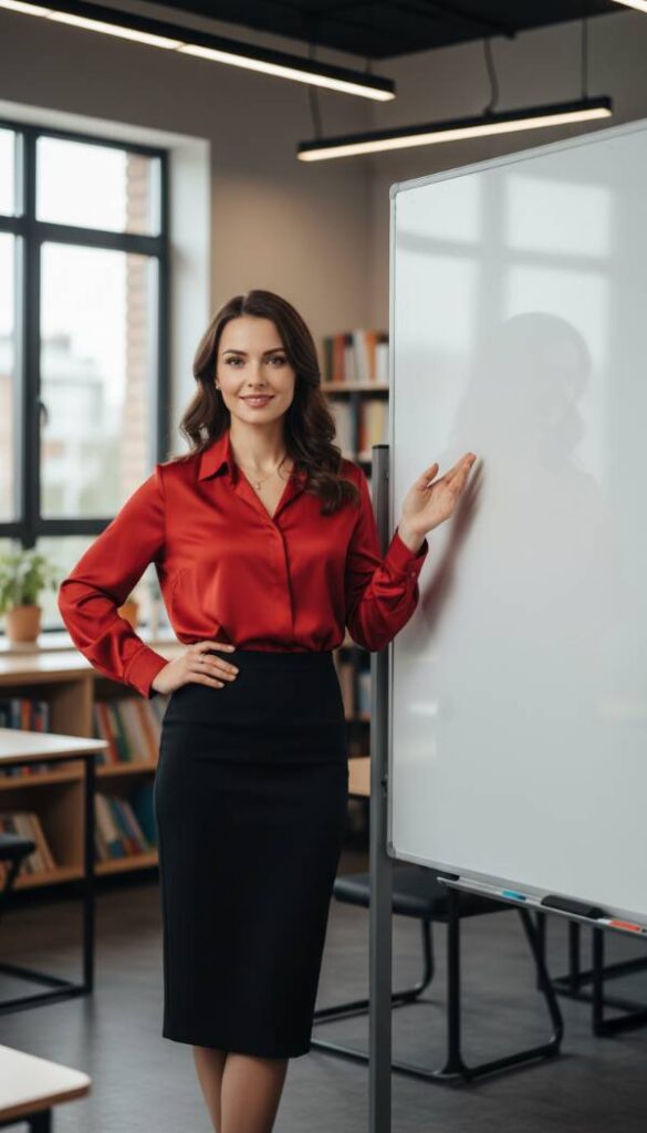 Inject a sophisticated pop of color into your professional wardrobe with this exquisite vermillion silk blouse, a nod to the trending cherry red palette of 2024. Its luxurious fabric drapes beautifully, offering a comfortable yet incredibly chic feel. Paired with a sleek black midi column skirt, the ensemble creates a long, elegant line that is both flattering and modern. This pairing exudes confidence and style, perfect for educators who wish to make a statement while maintaining a dignified presence. The rich hue and refined textures work in harmony, presenting an image of cultured professionalism ready for any academic environment.