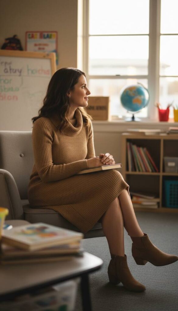 Wrap yourself in refined comfort with this exquisite ribbed sweater dress, an elevated essential for cooler weather. Crafted from a high quality, soft knit, its subtle ribbing adds textural interest and a flattering vertical line, enhancing the silhouette. The midi length ensures a professional and elegant appearance, while the inherent stretch of the fabric provides exceptional comfort and ease of movement throughout your day. This dress is a testament to sophisticated simplicity, offering a cozy yet utterly chic option that seamlessly transitions from classroom instruction to after school activities, making it an invaluable piece for any discerning teacher.