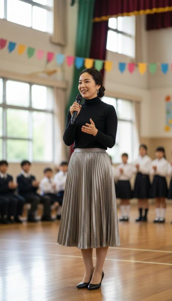 Infuse a touch of subtle allure into your academic wardrobe with this glimmering pleated midi skirt, a playful yet undeniably elegant choice. Featuring delicate pleats that catch the light, it offers a sophisticated shimmer without being overtly flashy. The fluid movement of the fabric ensures comfort and grace with every step, making it ideal for navigating bustling hallways or standing to teach. This skirt provides a contemporary twist on classic professionalism, easily paired with a simple knit or a crisp blouse for a balanced, chic ensemble. It is perfect for adding a touch of modern glam to your teaching persona.