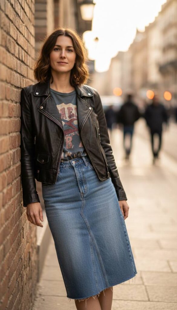 Reimagine casual elegance with a high waisted denim midi skirt, its sturdy yet soft fabric providing a comfortable and effortlessly chic foundation. The denim’s subtle texture and gentle fading tell a story of relaxed sophistication. Pair this versatile piece with a vintage inspired graphic tee, its soft cotton offering a pleasing contrast to the denim’s weight. Complete the ensemble with a perfectly fitted leather jacket, its supple hide adding a touch of edgy refinement. This look epitomizes cool girl charm, perfect for a woman seeking stylish comfort.