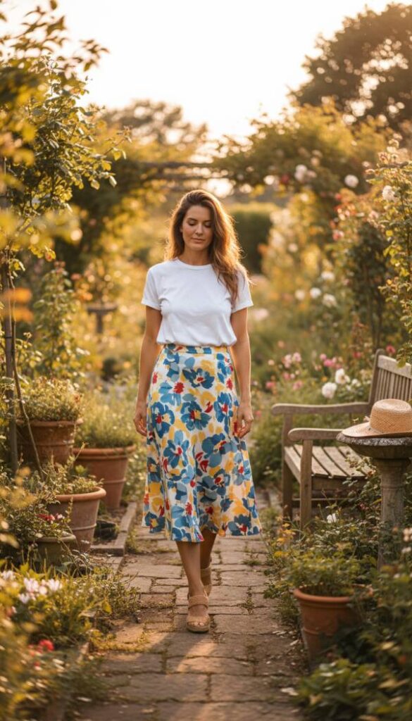 Embrace the whimsical charm of a flowy floral print midi skirt, its lightweight fabric dancing with every breeze. The vibrant botanical patterns, painted across a soft chiffon or rayon, evoke a sense of joyous freedom and natural beauty. The fabric is light and airy, creating an ethereal movement. Complement this romantic piece with a pristine white linen tee, its breathable texture providing a beautiful counterpoint to the skirt’s fluidity. Finish the look with natural espadrille wedges, grounding the airy ensemble with earthy charm. A delightful outfit for a woman enjoying a relaxed day.