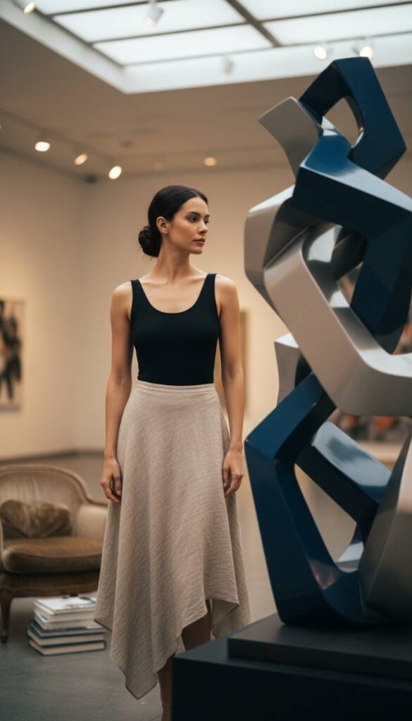 Inject a dose of contemporary flair with an asymmetrical midi skirt, its unconventional hemline creating a dynamic and visually interesting silhouette. Crafted from a fluid crepe or a polished twill, the fabric drapes beautifully, emphasizing the unique cut. The material feels sophisticated and moves with elegant fluidity. Complement this artful piece with a sleek, minimalist bodysuit, its clean lines providing a perfect contrast to the skirt’s innovative design. Statement jewelry will enhance this sophisticated look, making it an ideal choice for the fashion forward woman who appreciates modern artistry.