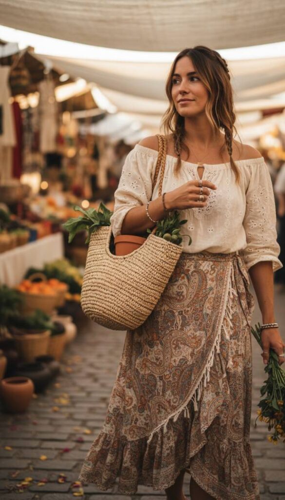 Discover the effortless allure of a wrap around midi skirt, its soft cotton voile or linen blend fabric flowing with a relaxed grace. The adjustable waist ensures a perfect fit, while the natural fibers feel wonderfully breathable against the skin. The fabric’s subtle texture adds an organic, earthy appeal. Pair this bohemian inspired piece with a delicate peasant blouse, adorned with intricate embroidery or subtle lace details, its relaxed silhouette mirroring the skirt’s easy going charm. Chunky block heels complete this free spirited yet refined ensemble for a stylish woman.
