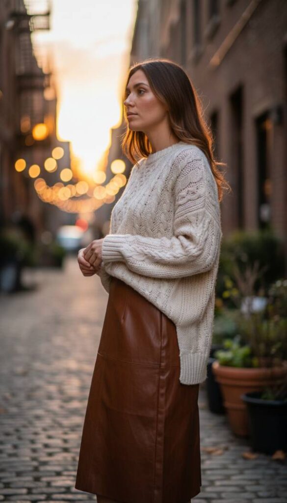 Embrace a touch of rebellious elegance with a faux leather midi skirt, its smooth, rich surface exuding an undeniable cool factor. The supple texture of the faux leather feels luxurious and slightly edgy against the skin, offering a comfortable yet chic wear. Team this statement piece with an oversized, chunky knit sweater, its cozy texture providing a tactile contrast to the sleekness of the skirt. Ankle boots, perhaps with a slight heel, will ground this look, creating a balanced and fashion forward ensemble for the confident woman. This is sophisticated and daring.