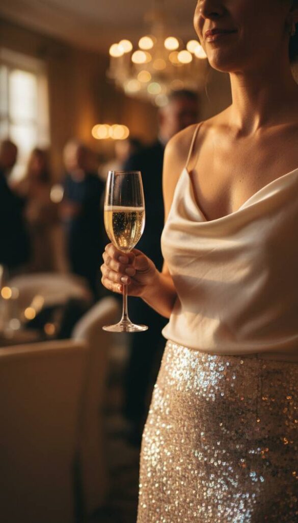 Illuminate the evening with a sequin embellished midi skirt, its dazzling surface catching and reflecting every glimmer of light. Thousands of tiny sequins create a mesmerizing texture that shimmers with movement, ensuring you are the center of attention. This skirt feels wonderfully festive and opulent. Pair its celebratory sparkle with a luxurious silk camisole, its smooth, lustrous fabric providing a sophisticated counterpoint to the sequins. Strappy high heels and minimal accessories will complete this show stopping ensemble, perfect for a woman ready to make a grand entrance at any soirée or celebration.