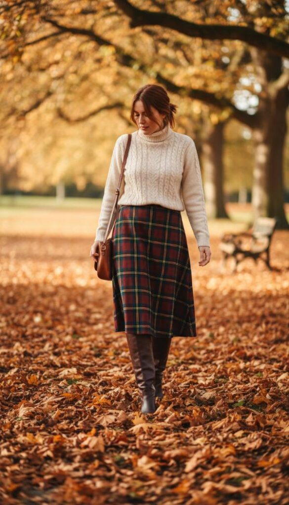 Embrace the crisp elegance of autumn with a tartan plaid midi skirt, its rich wool blend fabric offering warmth and a classic, heritage inspired aesthetic. The intricate plaid pattern, in deep jewel tones or traditional earthy hues, speaks of timeless style. The fabric has a comforting weight and a soft, inviting texture. Pair this distinguished piece with a fitted turtleneck sweater, its sleek silhouette providing a sophisticated contrast. Knee high leather boots will complete this impeccably styled ensemble, perfect for a woman navigating cooler weather with undeniable panache and comfort.