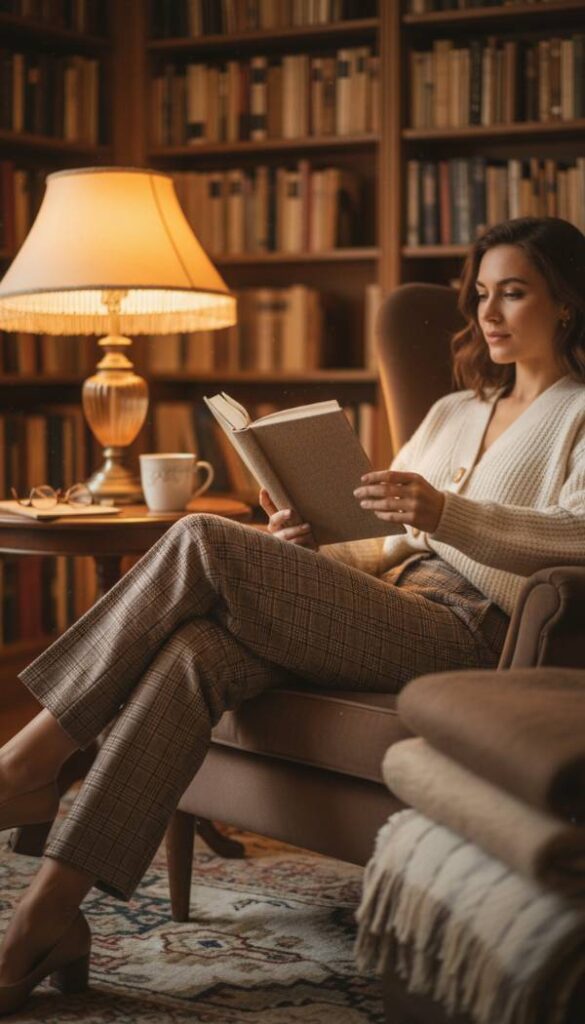 Elevate your wardrobe with sophisticated brown plaid patterned trousers. The intricate plaid design, featuring varying shades of brown, beige, and subtle hints of a contrasting color, offers visual interest and a classic, heritage inspired aesthetic. The tailored fit ensures a polished silhouette, while the structured fabric holds its shape beautifully. These trousers exude an intellectual charm and a refined elegance, perfect for adding a touch of timeless pattern to your professional or casual ensembles. When paired with a solid colored, finely knitted cardigan, the outfit achieves a harmonious balance between pattern and texture, a testament to thoughtful styling. They promise a distinguished look for any discerning fashion enthusiast.