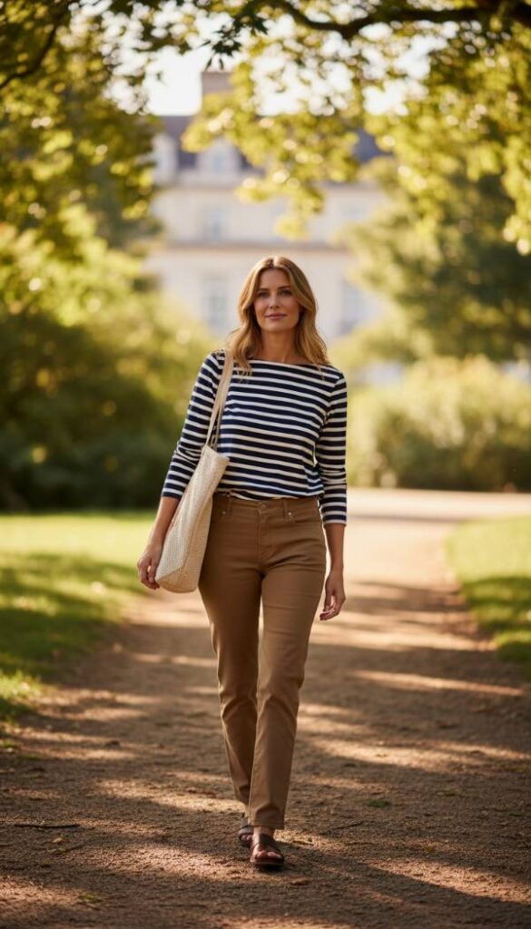 Embrace the understated elegance of straight leg tan brown chinos, a quintessential piece for versatile styling. The durable yet soft cotton twill fabric provides a comfortable, breathable feel that is perfect for everyday wear. Their timeless tan brown hue, reminiscent of warm sand and sun kissed landscapes, offers a neutral base that pairs effortlessly with a myriad of colors. The straight leg cut provides a clean, elongated silhouette, ensuring a polished appearance without sacrificing comfort. When paired with a classic striped Breton top, the ensemble evokes a casual European chic, a blend of relaxed sophistication and effortless charm. These chinos are a true wardrobe hero, adaptable for various occasions.