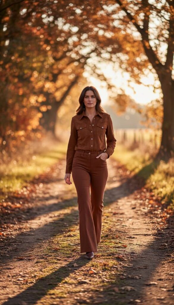 Step back in time with a modern twist in retro chic chestnut bootcut pants. The rich, warm chestnut brown hue, reminiscent of polished wood and autumnal tones, offers a deep, inviting warmth. The signature bootcut flare begins gracefully below the knee, creating an elongated and flattering leg line that pairs perfectly with boots or heels. Crafted from a stretchy yet structured fabric, these pants provide both comfort and a smooth, defined silhouette. They evoke a confident, vintage inspired style that remains perennially fashionable. When teamed with a soft suede western style shirt, the textures complement each other beautifully, creating an ensemble that is both earthy and effortlessly cool, perfect for a casual yet styled appearance.
