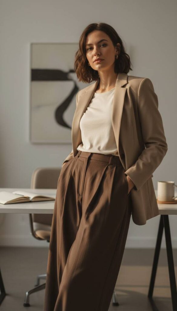 Step into the realm of refined sophistication with dark brown pleated trousers. The subtle pleating at the waist adds a touch of classic tailoring, creating a graceful drape that flows effortlessly down the leg. The deep, resonant brown, akin to rich earth, conveys an air of quiet luxury and serious style. Crafted from a premium wool blend, the fabric offers a subtle texture and a comfortable weight, perfect for polished office wear or sophisticated evening events. Paired with a crisp beige blazer, the combination is sharp and authoritative, a testament to thoughtful dressing. These trousers embody a timeless elegance, promising both comfort and an impeccable aesthetic.