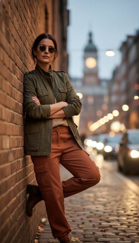 Discover the blend of utility and style with rust brown cargo pants. Their relaxed fit and practical side pockets offer a distinct urban edge, while the rich, earthy rust brown hue brings warmth and sophistication to their casual design. The robust cotton fabric feels substantial yet comfortable, ideal for dynamic daily activities. This unique shade, reminiscent of ancient terra cotta and autumnal leaves, adds an unexpected pop of color without being overtly bright. When teamed with an olive green utility jacket, the ensemble creates an adventurous yet polished aesthetic, perfect for navigating city streets or weekend excursions. They offer both comfort and an effortlessly cool appeal.