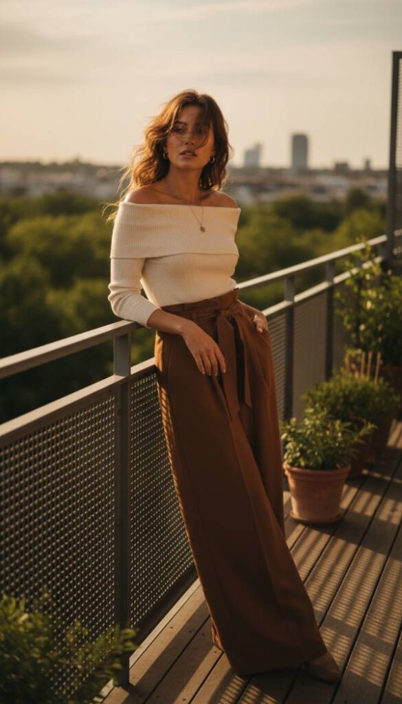 Envision the luxurious sweep of wide leg caramel brown trousers, their fabric a soft flowing dream against the skin. The rich, warm hue evokes images of sun dappled autumn leaves and freshly brewed coffee, offering a comforting yet sophisticated appeal. They drape elegantly from the waist, creating a graceful silhouette that dances with every movement. Paired with a cream cashmere knit, the texture is an inviting embrace, promising warmth and an understated glamour. This ensemble speaks volumes of quiet confidence and refined taste, perfect for a crisp morning stroll or an upscale brunch. The gentle sheen of the material catches the light beautifully, highlighting its exquisite quality.