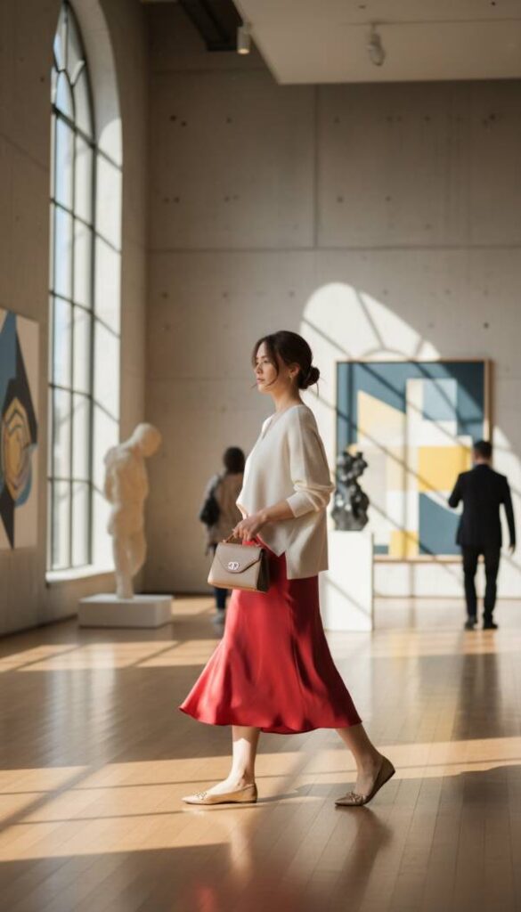 Infuse your Valentine’s Day ensemble with a pop of passionate color courtesy of this vibrant cherry red silk midi skirt. Its fluid fabric drapes beautifully, creating an effortlessly chic and sophisticated movement with every step. The rich hue is a major trend for 2024/2025, offering a refreshing alternative to traditional romantic palettes. Pair it with a complementary neutral knit or a structured white blouse for a balanced yet striking look. This versatile piece transitions seamlessly from a romantic brunch to an elegant evening affair, embodying modern grace.