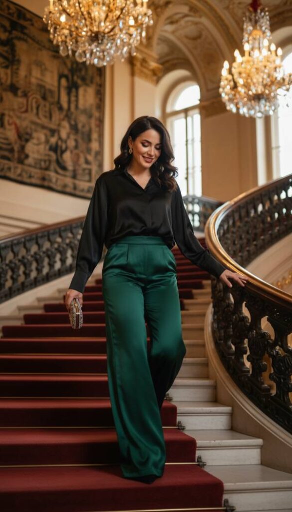 Indulge in unparalleled comfort and high fashion with these luxurious emerald green wide leg satin trousers. The rich, jewel tone color adds a touch of regal elegance, while the flowing satin fabric creates a dramatic, elongated silhouette. Perfect for a sophisticated dinner or a relaxed yet refined evening, these trousers offer a refreshing departure from traditional dresses. Pair them with a fitted black turtleneck or a delicate camisole for a balanced look. This piece combines opulent texture with a modern, relaxed fit, ensuring both comfort and exceptional style for any romantic occasion.