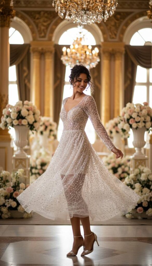 Radiate ethereal beauty in this exquisite embellished mesh midi dress, a vision of delicate glamor. Adorned with subtle, shimmering embellishments that catch the light with every movement, this dress offers a sophisticated take on transparency. The sheer mesh is artfully layered, providing coverage while maintaining a sensual allure. Its midi length and elegant silhouette make it suitable for a variety of romantic settings, from a cocktail reception to an intimate dinner. This piece is a celebration of intricate craftsmanship and modern femininity, ensuring you feel utterly captivating.