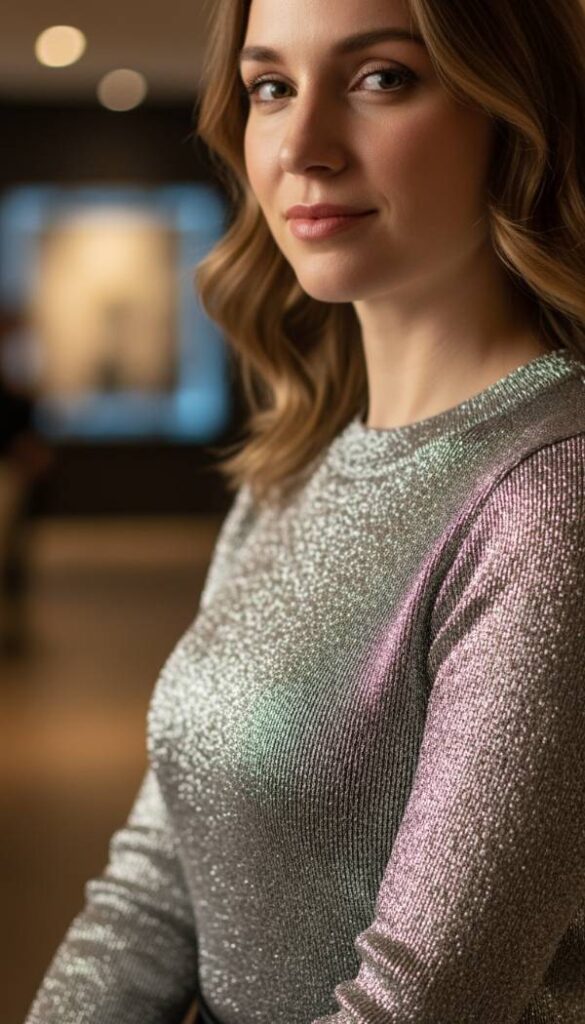 Make a bold, futuristic statement with this shimmering metallic silver knit long sleeve top. The subtle sheen of the fabric catches the light, creating a dynamic and captivating effect that is both modern and luxurious. Its fine gauge knit ensures a comfortable, form flattering fit, making it an unexpected yet sophisticated choice for a Valentine’s evening. Pair it with dark wash wide leg jeans or a sleek black leather skirt for a high contrast, fashion forward ensemble. This piece is perfect for those who appreciate understated glamor with a contemporary edge.