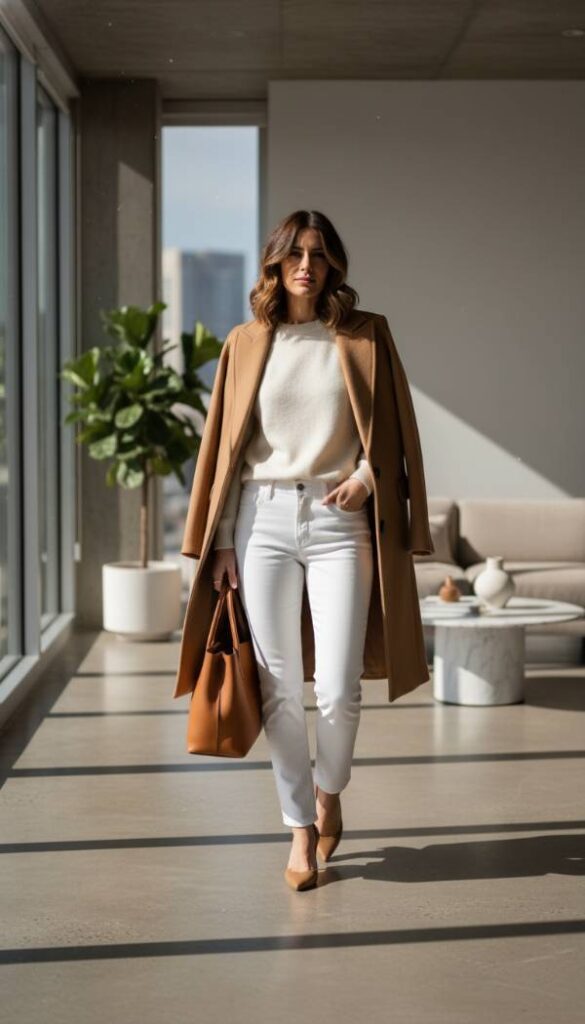 Embrace an understated elegance with this perfectly curated look. Straight leg white jeans provide a crisp foundation, allowing luxurious textures to shine. Pair them with a sumptuously soft cream cashmere crewneck sweater, its refined simplicity speaking volumes. Drape an impeccably tailored camel wool coat over your shoulders, adding a layer of effortless sophistication. Complete this high end aesthetic with an immaculate leather tote bag and minimalist gold jewelry, ensuring every detail exudes a polished, discerning taste. This ensemble effortlessly balances comfort with unparalleled chic, ideal for upscale daytime engagements or art gallery visits.