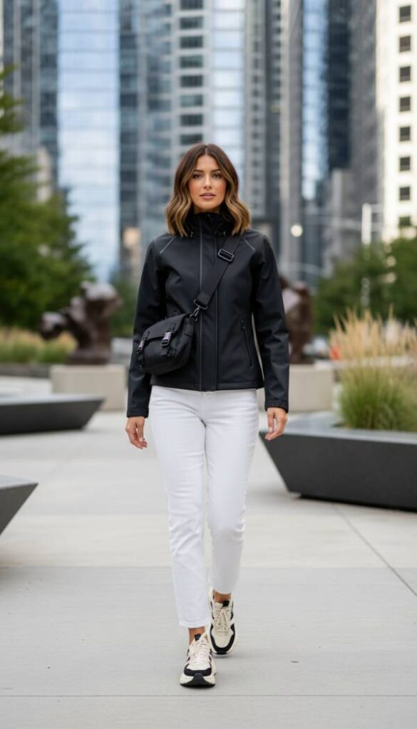Integrate the practical elegance of Gorpcore into your urban wardrobe without compromising on high fashion appeal. Begin with straight leg white jeans, providing a clean, versatile base. Introduce a sleek black technical shell jacket, its high performance fabric offering a contemporary, functional edge. Elevate the look with fashion forward chunky platform sneakers that blend comfort with undeniable style. Accessorize with a small functional crossbody bag, emphasizing the utility driven aesthetic. This sophisticated blend of street style and outdoor readiness creates a unique, modern silhouette, ideal for adventurous city dwellers.