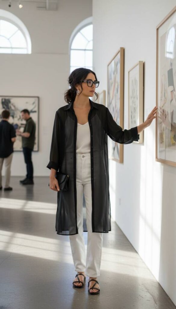 Dive into the ethereal charm of sheer fabrics, anchored by the crisp simplicity of white jeans. Choose white straight leg jeans as your solid foundation. Layer a translucent black organza tunic shirt over a simple white camisole, creating a captivating play of opacity and transparency. This delicate layering adds depth and intrigue without overwhelming the silhouette. Complete the look with sleek black sandals or minimalist pointed toe flats. This ensemble is perfect for artistic events, evening gatherings, or any occasion where a sophisticated, visually interesting statement is desired.