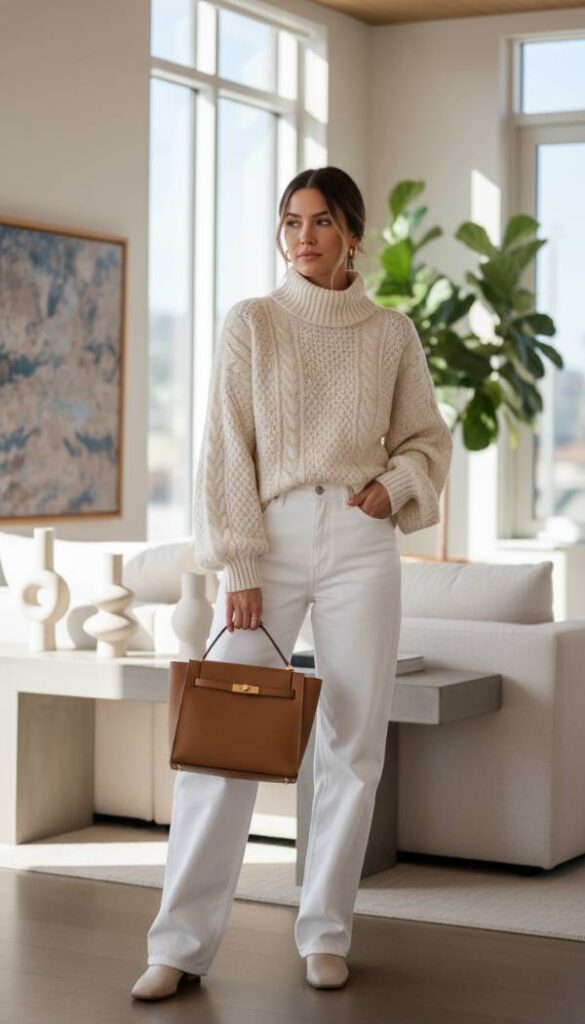 Elevate your denim with the dramatic flair of architectural knitwear, creating a visually compelling silhouette. Opt for white relaxed fit jeans, allowing for comfort and a modern line. Pair them with a cream colored chunky knit sweater featuring dramatic balloon sleeves and a high funnel neck, making the top a true sculptural statement. The unique shape of the knitwear adds an artistic dimension. Carry a structured leather bag to maintain a polished finish. This ensemble is ideal for sophisticated casual outings, bringing warmth and avant garde style to cooler days.