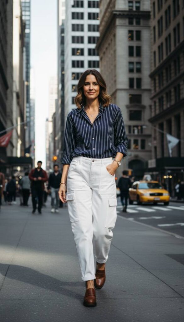 Redefine utilitarian style with white cargo jeans, blending functionality with high fashion appeal. Select white cargo jeans featuring subtly oversized pockets and a refined cut, transforming a casual piece into a statement. Pair them with a crisp navy blue striped button up shirt, creating a sophisticated nautical inspired contrast. Complete the look with chunky heeled loafers or modern block heeled boots for an added touch of polish and height. This ensemble offers a smart, practical yet undeniably chic aesthetic, perfect for navigating dynamic urban landscapes or creative work environments.