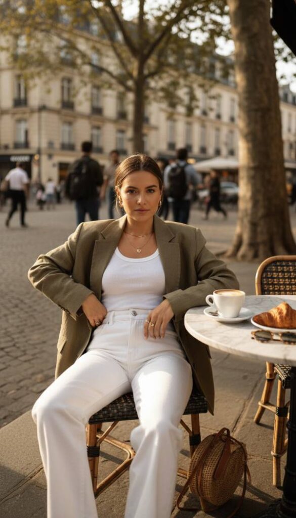 Reimagine the power of tailoring with an updated oversized blazer, perfectly paired with white denim. Start with high waisted white barrel leg jeans, offering a contemporary, relaxed fit. Complement them with a fitted ribbed white tank top, creating a streamlined base. The centerpiece is an impeccably tailored oversized khaki linen blazer, its relaxed yet structured form exuding an air of effortless cool. Finish the look with minimalist gold jewelry and sleek, modern loafers. This ensemble strikes a masterful balance between casual comfort and sophisticated polish, ideal for sophisticated daytime ventures.