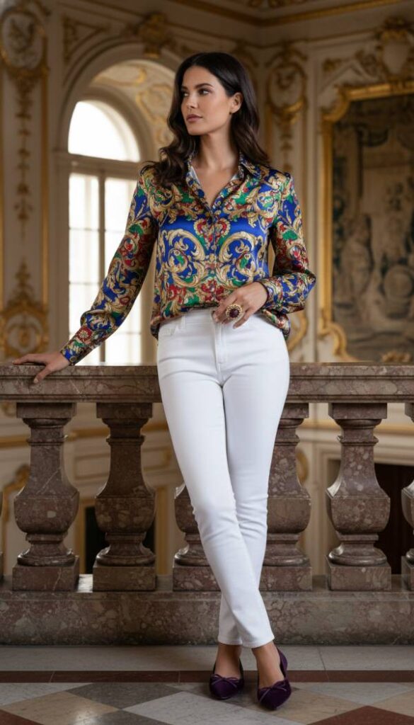 Indulge in the rich textures and patterns of baroque inspired fashion, using white jeans as a fresh, bright counterpoint. Choose white slim fit jeans, allowing them to provide a clean canvas. Pair them with a vibrant jewel toned silk blouse adorned with an intricate baroque pattern, its luxurious fabric and detailed design exuding grandeur. Complement this lavish top with rich velvet ballet flats in a deep coordinating color. A large statement ring can further enhance the opulent feel. This ensemble is perfect for an elegant dinner, a cultural event, or any occasion requiring a touch of refined drama.