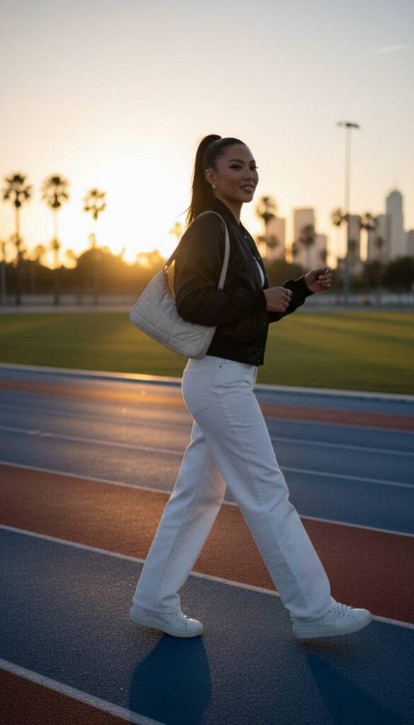 Marry athletic comfort with high fashion sophistication in this refined sport luxe ensemble. Begin with white wide leg jeans, offering a contemporary, flowing silhouette. Layer a sleek black satin bomber jacket, its lustrous fabric elevating the athletic aesthetic. Complete the look with designer white leather sneakers that provide both comfort and a touch of upscale casual. Carry a chic nylon shoulder bag to maintain the streamlined, modern feel. This outfit is perfect for dynamic city living, offering a blend of effortless cool and polished, active style for the discerning woman.