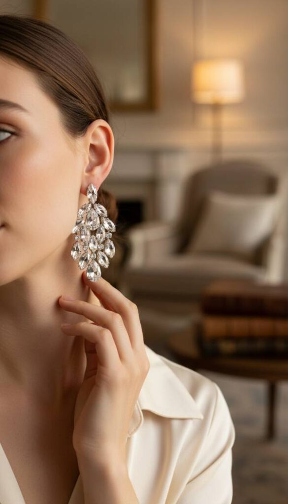 Adorn your ears with the dazzling brilliance of statement crystal drop earrings, designed to catch every eye and sparkle with every turn of your head. These exquisite pieces feature multiple facets that refract light into a mesmerizing dance of colors, creating a captivating glow around your face. Their elegant length draws attention to your neckline, adding a touch of sophisticated drama without overwhelming your look. The gentle weight of the earrings feels substantial yet comfortable, a constant reminder of their luxurious presence. These earrings are the perfect final touch for any elegant winter outfit, infusing a sense of opulence and refined glamour into your overall aesthetic.