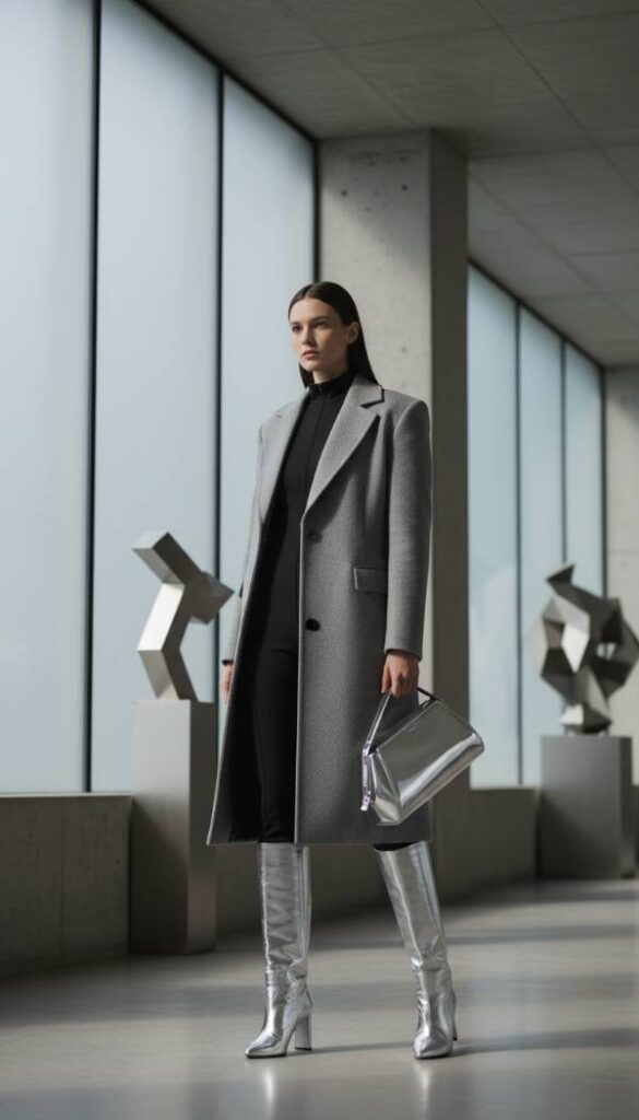 Elevate a classic stone grey structured coat with strategic metallic accents, tapping into the emerging trend of understated futurism for 2025. The coat’s clean lines and neutral hue provide a sophisticated canvas for high shine silver or gold accessories, such as sleek metallic ankle boots or a sculptural handbag. Keep the base outfit minimalist, perhaps an all black ensemble, to allow the metallic elements to truly pop and add an unexpected edge. This look is about controlled glamour, offering a modern twist on winter dressing that feels both polished and daring, perfect for evening events or making a subtle yet impactful statement during the day.