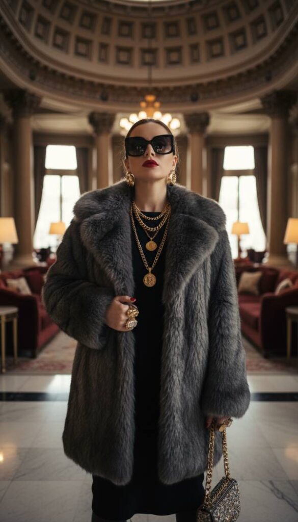 Channel the opulent ‘Mob Wife’ aesthetic with a dramatic grey coat featuring an oversized, luxurious faux fur collar and cuffs. This statement piece demands attention, perfectly paired with tailored leather trousers or a daring animal print slip skirt for maximum impact. Accessorize with bold, gold toned jewelry, oversized dark sunglasses, and a structured leather tote bag to amplify the lavish, unapologetically confident vibe. The exaggerated proportions and rich textures make this ensemble a powerful expression of high fashion drama, ideal for making an entrance at exclusive evening events or commanding the attention of any room. It is fierce, fashionable, and unforgettable.