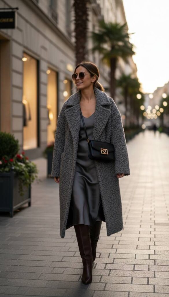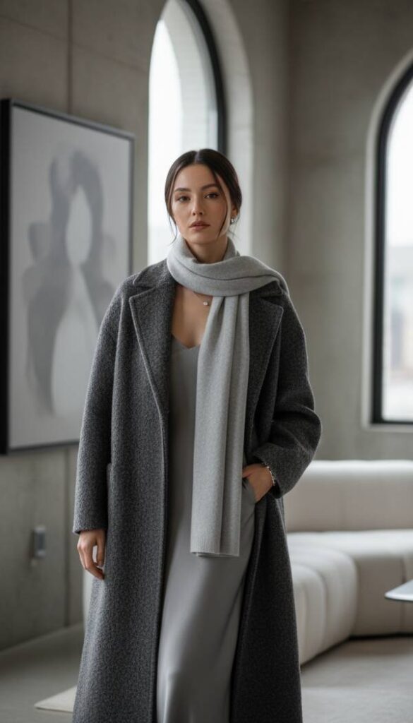 Master the art of quiet luxury with a monochromatic grey ensemble, where varied textures create visual richness without relying on color. Begin with a structured grey wool coat as your anchor, then layer with a luxurious silk slip dress in a slightly lighter grey and a chunky cashmere scarf in a deeper charcoal. Incorporate fine knit accessories like gloves and a small leather bag in complementary grey tones. This sophisticated approach to dressing highlights the beauty of materiality and subtle tonal shifts, showcasing a deep understanding of curated style. It is a timeless, elegant look for the woman who appreciates understated glamour and high quality fabrics.