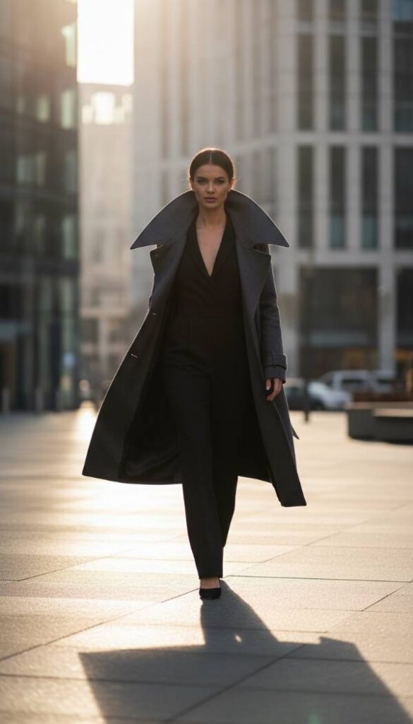Redefine classic outerwear with a grey trench coat featuring an exaggerated, statement making collar, a key detail for 2025. This bold design element elevates the traditional trench, adding a touch of dramatic flair and contemporary elegance. Pair it with a tailored jumpsuit in a dark, rich hue or a sleek, form fitting knit dress to maintain a sophisticated and streamlined silhouette. Modern, minimalist boots or chic pointed toe pumps will complete the look, drawing attention to the coat’s unique design. This ensemble is perfect for the confident woman who appreciates classic pieces reimagined with a distinct, fashion forward twist, making an unforgettable sartorial impression.