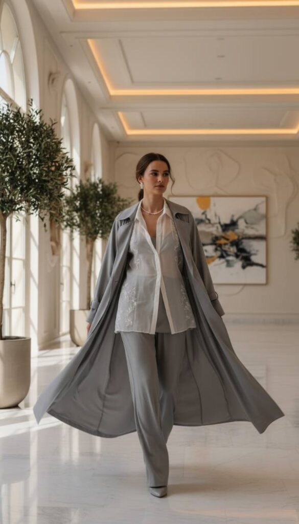 Embrace architectural fashion with a grey coat featuring dramatic, sculptural bell sleeves, a bold statement piece for 2025. This design transforms outerwear into a wearable work of art, with its exaggerated proportions adding an avant garde edge. Pair it with a minimalist, column silhouette dress or a sleek jumpsuit to allow the coat’s striking sleeves to be the undisputed focal point. Elegant, understated boots or sleek pumps will complete this sophisticated look. This ensemble is for the woman who views fashion as artistic expression, confidently choosing pieces that are both unique and impeccably crafted, destined to turn heads in any refined setting. It is a true statement of fashion forward thinking.