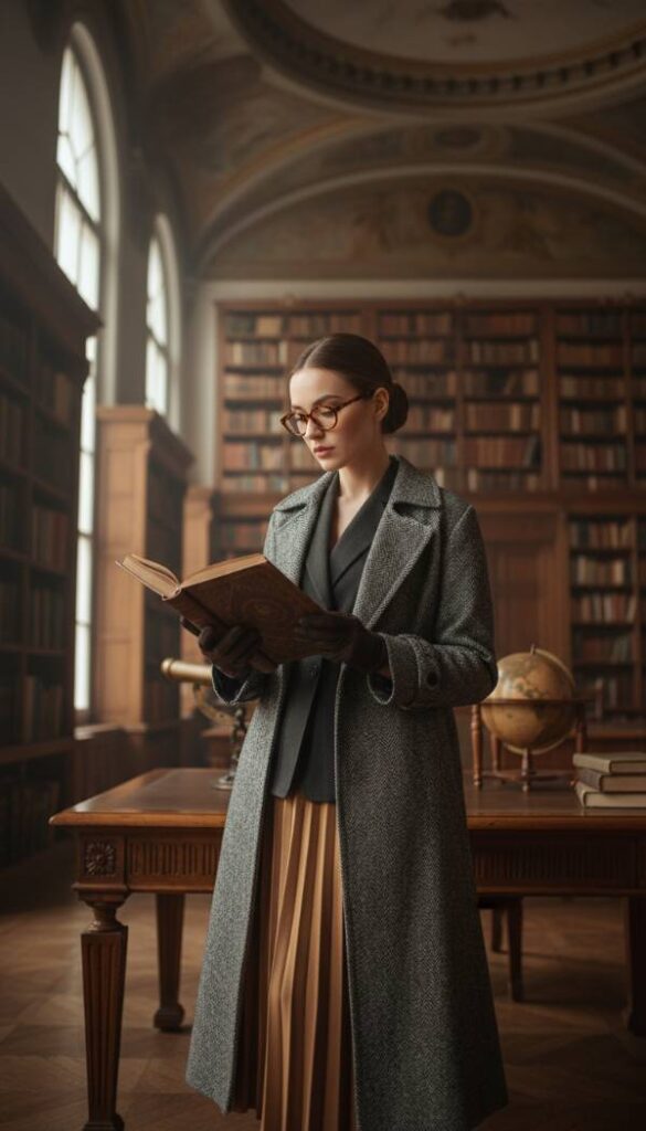 Dark Academia Reimagined With A Herringbone Grey Trench