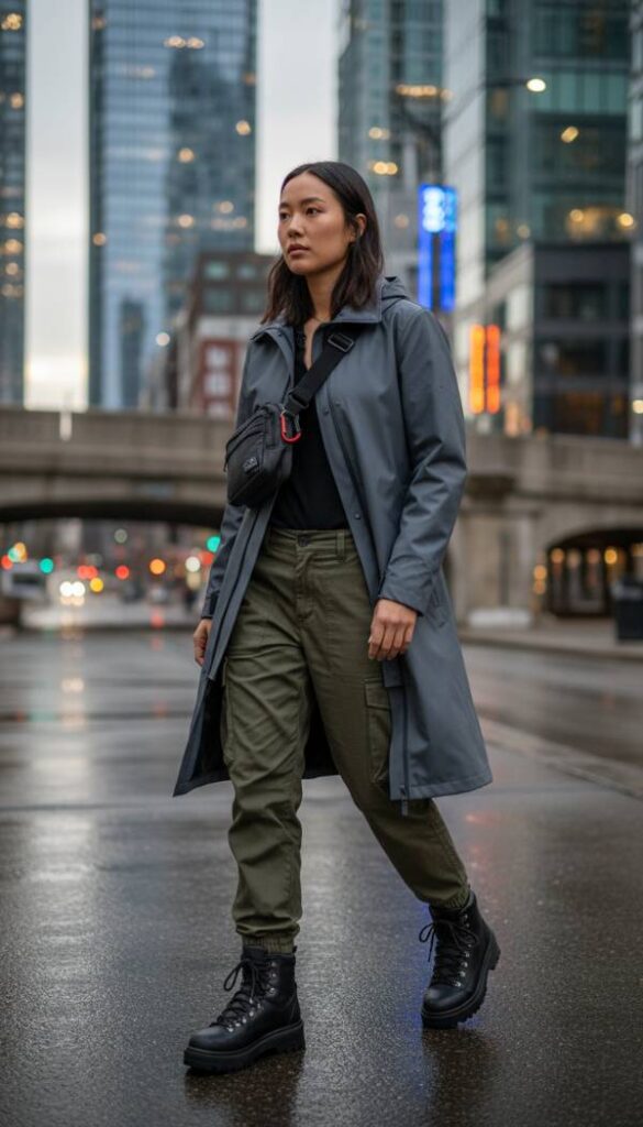 Reinvent utility with an elevated Gorpcore inspired grey technical trench coat, blending high performance functionality with refined urban style. This contemporary trench, crafted from advanced waterproof fabrics, effortlessly complements sleek cargo trousers or a modern utility skirt. Pair it with chunky sole designer boots and a luxurious technical knit sweater for a look that is both practical and fashion forward. The interplay of structured lines and utilitarian details makes this ensemble perfect for navigating city streets in comfort and unparalleled style. It is a sophisticated nod to outdoor wear, reimagined for the discerning fashion enthusiast seeking a balance of form and function. This creates an adventurous yet polished aesthetic.