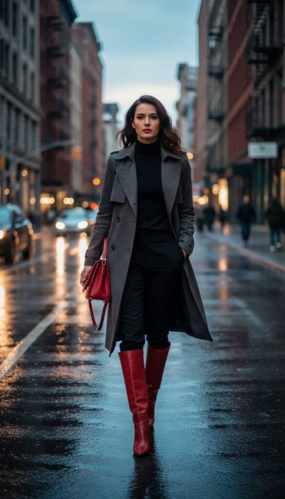 Infuse your winter wardrobe with a vibrant ‘Cherry Red’ accent, a defining trend for 2025, by pairing it with a sophisticated charcoal grey trench coat. The trench’s classic silhouette provides a refined backdrop for a bold pop of color through a meticulously chosen accessory, such as high gloss cherry red leather ankle boots or a chic top handle bag. Keep the rest of the outfit sleek and understated with tailored black trousers and a cashmere turtleneck to allow the red to truly shine. This look achieves a perfect balance of timeless elegance and contemporary flair, showcasing a sophisticated grasp of color theory and current trends, making it an instantly recognizable statement of modern style.