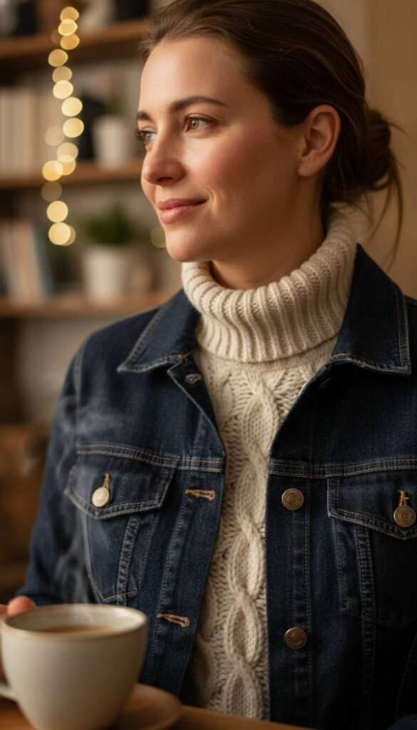 Envision the comforting bulk of an oversized cream colored turtleneck sweater, its ribbed knit a gentle caress against the skin, peeking out from beneath a well worn denim jacket. The jacket, perhaps a darker wash, provides a structured contrast to the sweater’s fluid lines. Picture the warmth emanating from this ensemble as a frosty breeze nips at the windowpanes. Pair this with tailored black trousers and sturdy combat boots for an urban edge, or sleek leather leggings for a refined, contemporary look. The rich aroma of brewing coffee might subtly fill the air, complementing the visual warmth of the textured layers. Soft golden light from a nearby lamp casts long, inviting shadows.