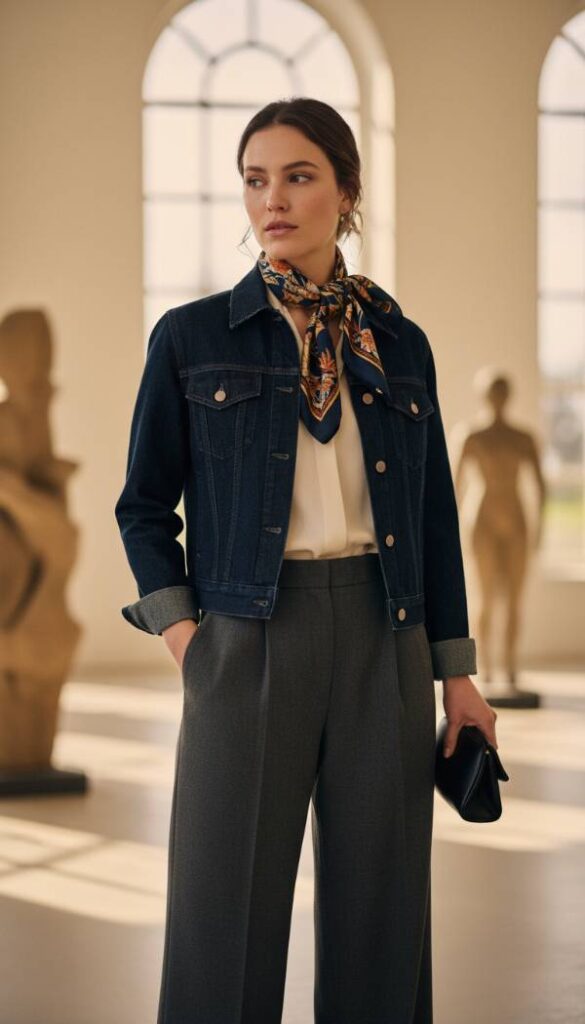 Visualize the exquisite drape of wide leg, impeccably tailored wool trousers in a rich charcoal or deep navy, paired with a crisp white blouse and a dark wash denim jacket. The unexpected element is a luxurious silk scarf, perhaps in a vibrant paisley or geometric print, elegantly tied around her neck, adding a splash of sophisticated color and delicate texture. The smooth, cool feel of the silk against her skin contrasts beautifully with the denim’s ruggedness. Imagine the subtle rustle of the silk as she moves, a whisper of refined elegance. This look exudes quiet confidence, perfect for a gallery visit or an upscale brunch. The lighting is soft and artful, highlighting the rich fabrics.