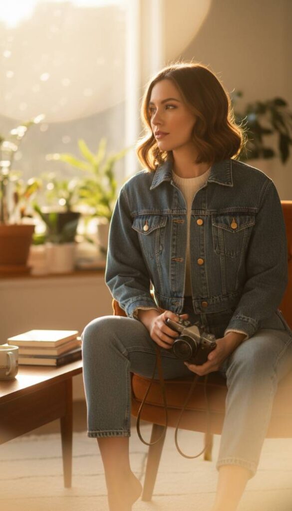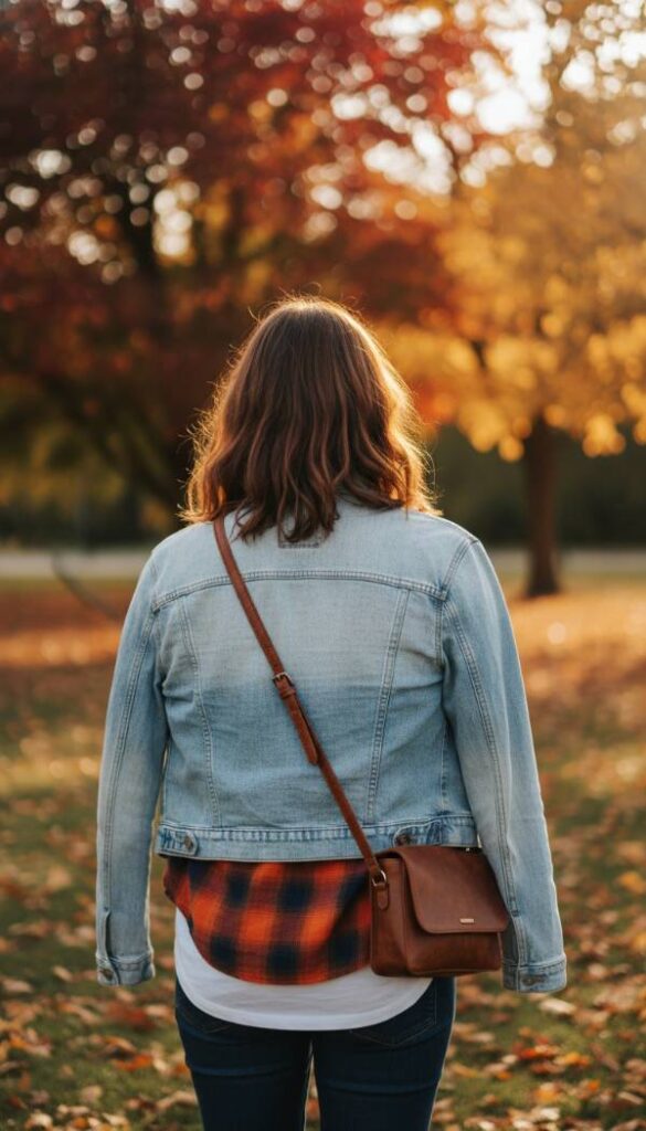 Visualize a soft, brushed flannel shirt, perhaps in a vibrant plaid pattern of deep reds and forest greens, worn open over a simple white tee, with a light wash denim jacket casually draped over the shoulders. The tactile sensation of the flannel’s warmth contrasts beautifully with the denim’s rugged texture. This ensemble speaks of relaxed weekends and crisp autumn air, transitioning effortlessly into winter with additional layers. Imagine the scent of pine needles and damp earth as she strolls through a park, leaves crunching underfoot. The ensemble is completed with straight leg jeans and comfortable, well worn sneakers, embodying an effortless cool. Natural diffused light softly illuminates the scene.